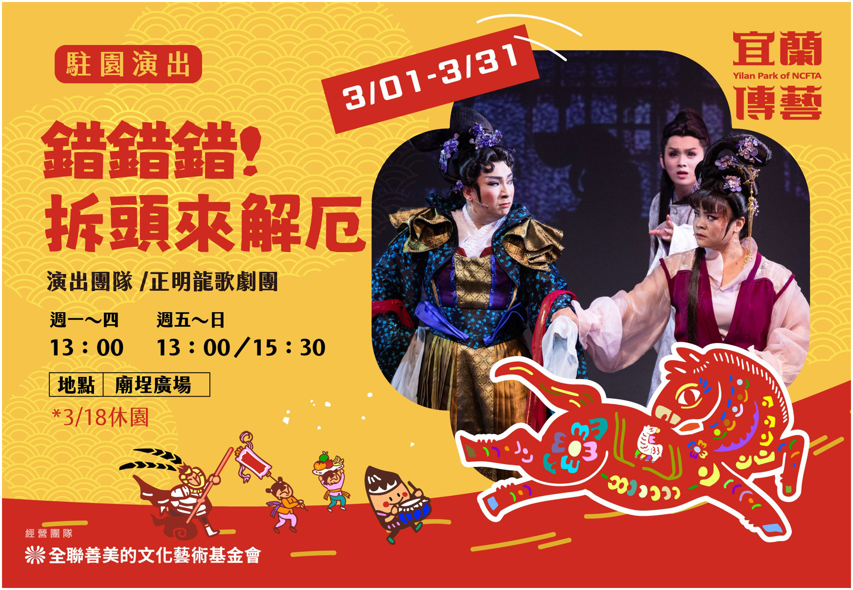 3月廟埕廣場將舉辦為期一個月之歌仔戲公演活動,由正明龍歌劇團擔綱演出。活動以傳統廟埕戲台為展演場域,呈現融合歷史典故與民間信仰題材之經典劇目,透過細膩唱腔與戲曲身段,展現臺灣傳統戲曲藝術之深厚底蘊。